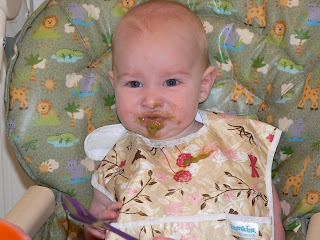 Here's some pictures from Dani's first time eating baby food.  It was green beans, and by the next day when I tried a second attempt at feeding green beans to Dani she would clamp her mouth closed tighter than Fort Knox.  She had the same reaction when I tried sweet peas, so maybe she's just not ready for baby food yet... a girl can hope, yeah?